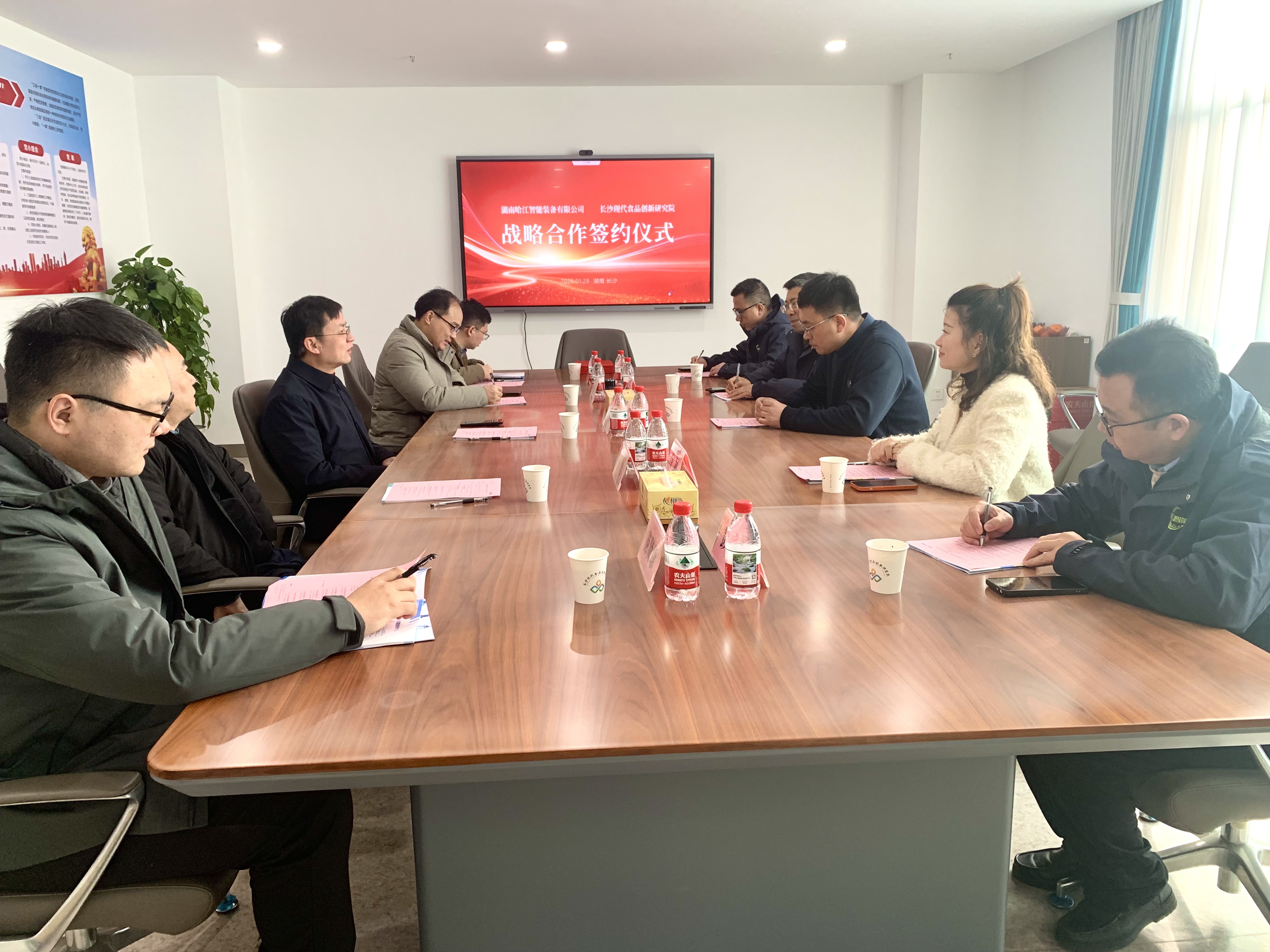 2026年1月28日上午,湖南农业大学长沙现代食品创新研究院(以下简称“研究院”)与湖南哈江智能装备有限公司(以下简称“哈江智能”)正式签署战略合作协议。研究院副院长周辉、哈江智能总经理董凡等双方代表出席仪式,共同见证这一重要时刻。